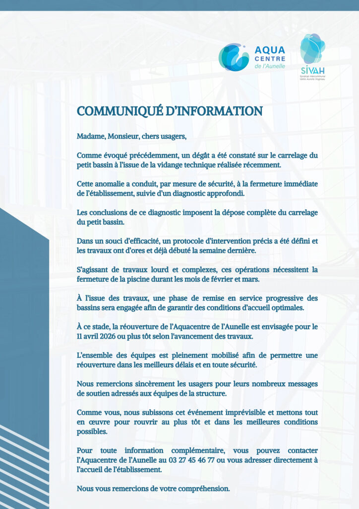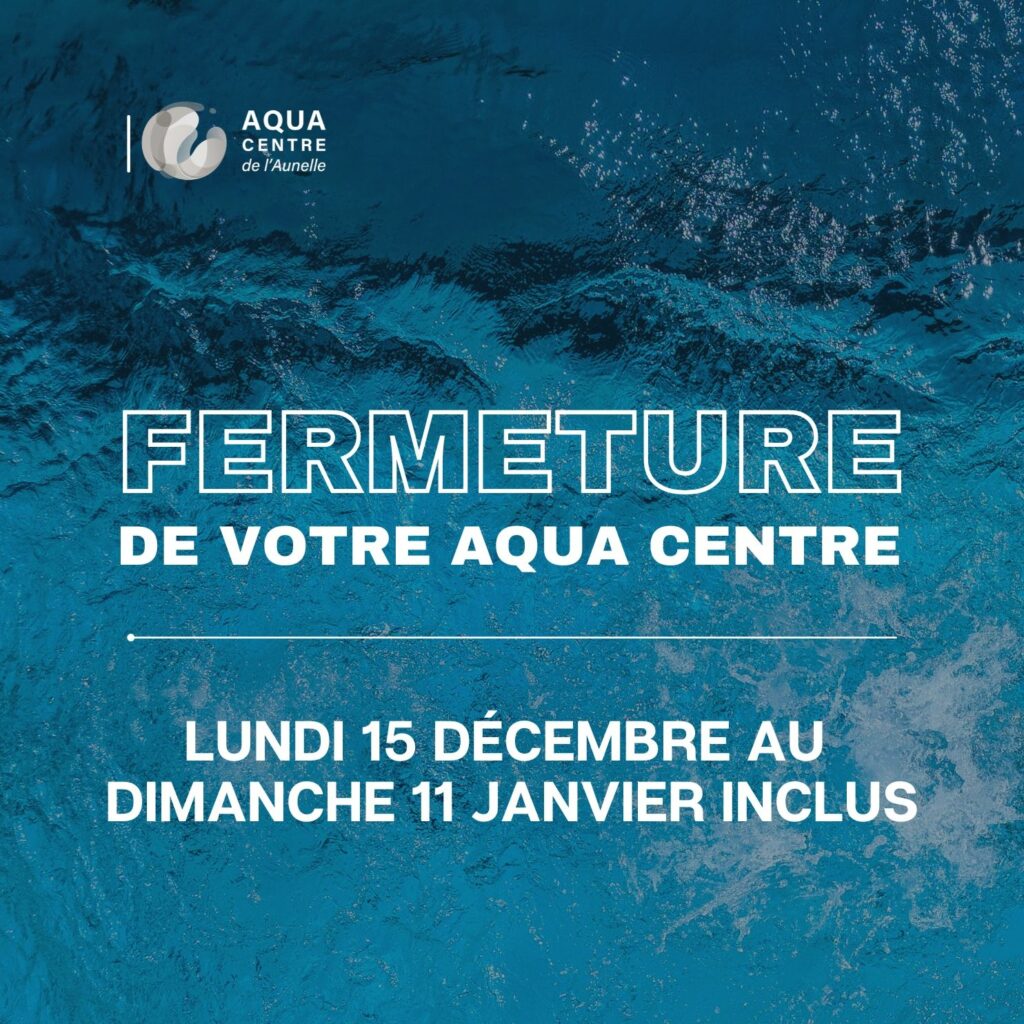 19 novembre 2025 Fermeture les 1er et 11 novembre omme chaque année, l’Aqua Centre de l’Aunelle ferme ses portes pour réaliser une vidange des bassins et un grand nettoyage de nos installations.Cette période de fermeture au public est également propice pour réaliser quelques interventions techniques, nécessaires au bon fonctionnement de notre équipement.Ainsi, la fermeture est […]