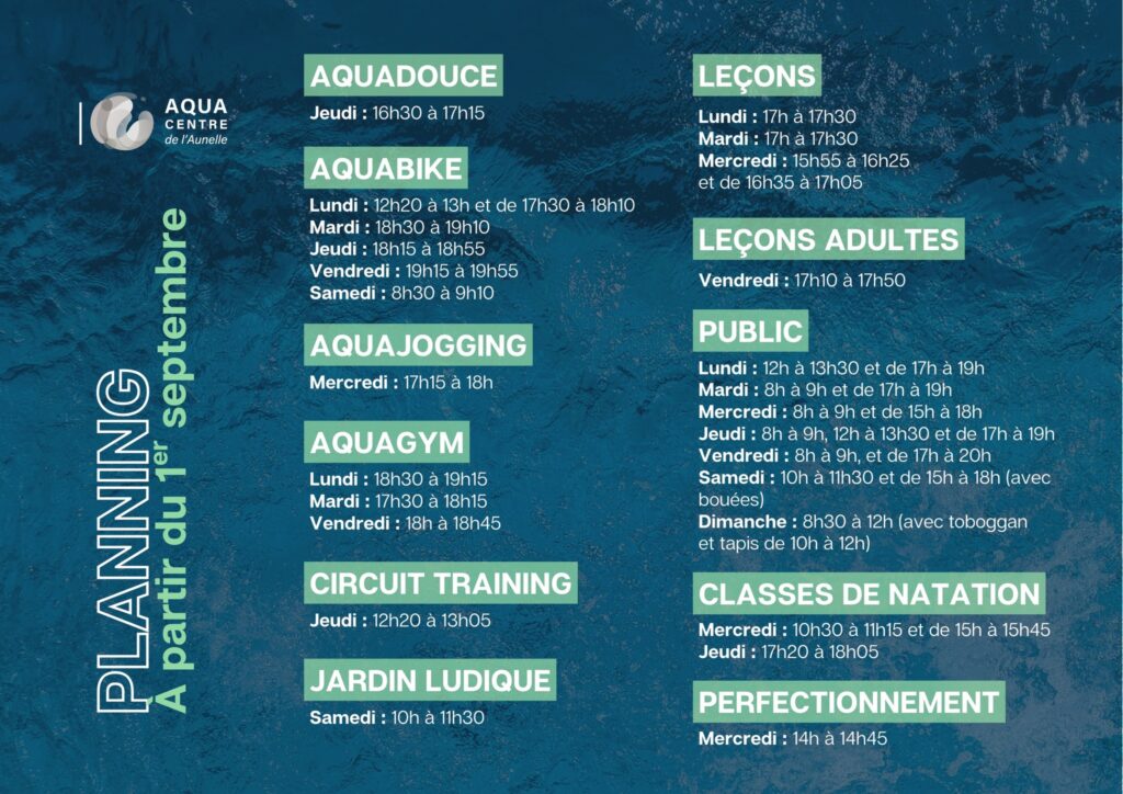 Changement d’horaires dès septembre 2025 28 août 2025 A compter du lundi 1er septembre, nous faisons nous aussi notre rentrée, et nous basculons sur la nouvelle programmation 2025-2026 pour les périodes scolaires. Nous vous laissons la découvrir via le visuel joint, sachant que des flyers sont d’ores et déjà disponibles à l’accueil de l’Aqua Centre. […]
