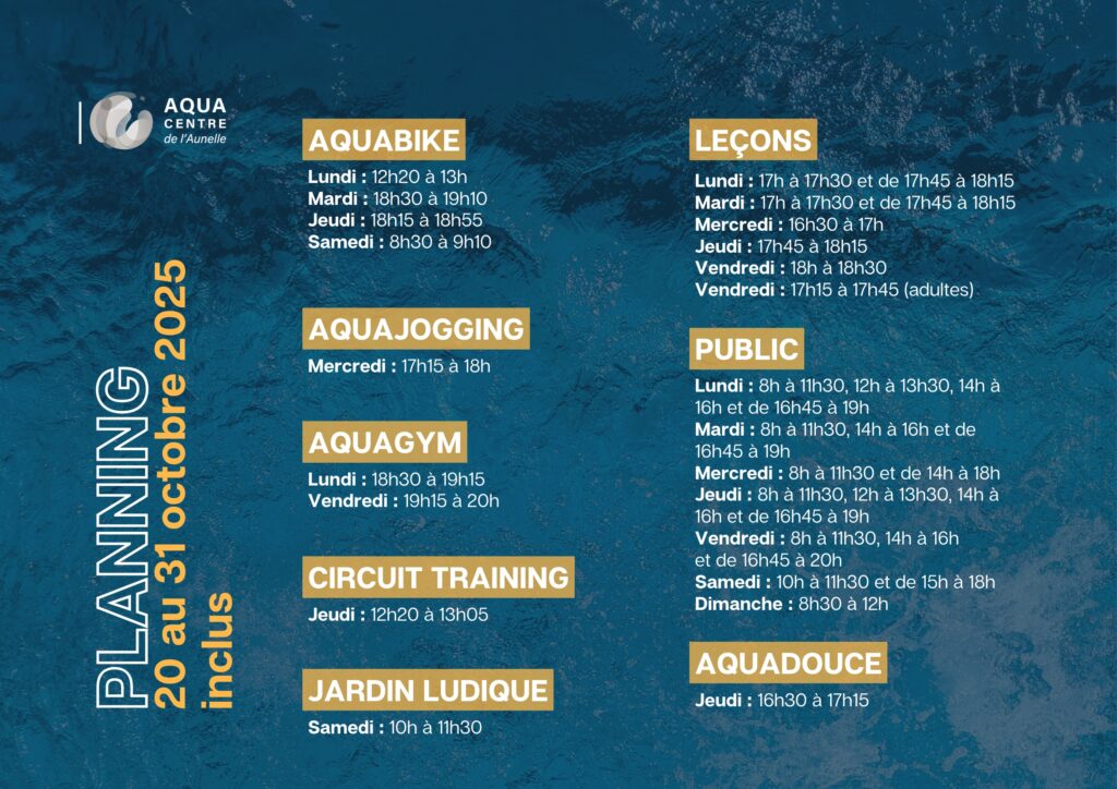 Votre Aqua Centre reste ouvert ce 18 septembre 20 octobre 2025 Du 20 au 31 octobre inclus, l’Aqua Centre de l’Aunelle adapte son planning pour que vous puissiez profiter pleinement de vos activités préférées 💦 🕑 Au programme : 🚴 Aquabike dès le lundi midi ou le samedi matin 🏊 Public élargi avec des créneaux […]
