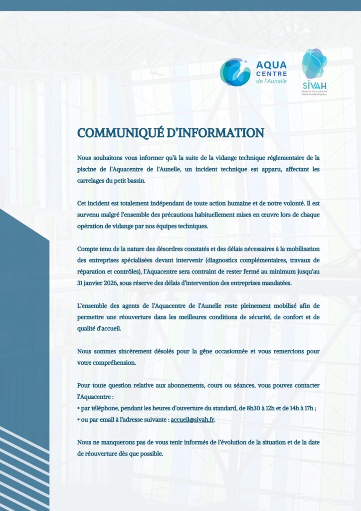 8 janvier 2026 Fermeture de votre Aquacentre durant le mois de janvier Un incident technique est apparu à l’issue de la vidange de décembre, à l’Aqua-Centre de l’Aunelle et malheureusement celui-ci entraine la fermeture de notre établissement aquatique pour ce mois de janvier 2026.Les équipes de l’Aquacentre sont à votre disposition au : 03 27 […]